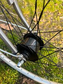 Vendo bicicletta appena terminata. Telaio italiano a congiunzioni sabbiato e poi spazzolato ed infine “verniciato” con owatrol. Ruote con cerchi doppia camera raggiati con incrocio snowflake in quarta. MOZZO POSTERIORE STURMEY ARCHER S2C FRENO CONTRAPEDALE. MOZZO ANTERIORE SHIMANO NEXUS CON DINAMO INTEGRATA. Kit completo di luci posteriore ed anteriori led collegate alla dinamo con fili dentro al Telaio e che rimangono accese anche da fermo per piu di 2 min. Sella brooks b33. Tutto la componestica utilizzata è nuova tranne la sella!