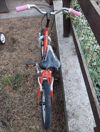 Bici per bambini con ruote diametro 16 pollici. Normali segni di usura ma tutto funzionante. Gomme e freni ancora in buono stato. Pronta per essere usata. Manca il carter della catena. Regalo rotelline laterali.