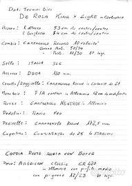 Bici corsa De Rosa x Light tenuta benissimo e una coppia ruote , vendo per raggiunti limiti di mia età. I dettagli tecnici sono riportati in figura, comunque altezza 53 da centro/centro e lunghezza 54 da centro/centro. Cambio Campagnolo Recordo 10 VV. Corona Ant. 50/34 C. Post. 12/30 a 10 vv. Selle ItaliaSLC. Ruote Casmpagnolo Neutron, Pedivelle Campagnolo Record 172,5, Copertura Continental da 25, Attacco DEDA 130. Pedalini Mavic KEO. Manubrio FSA Compact 42 cm. da centro/centro.
