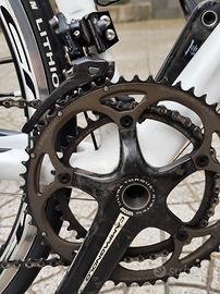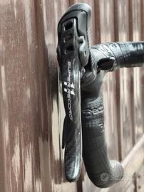 Bici da corsa in carbonio fasciato artigianale dell' artigiano Sarto (Vicenza) con gruppo Campagnolo super record 11 velocità pacco pignone 11x25 guarnitura 53x39 leve pedale 172,5 tubo sella pipa e manubrio sempre in carbonio Deda, ruote fulcrum racing zero complete di sacche