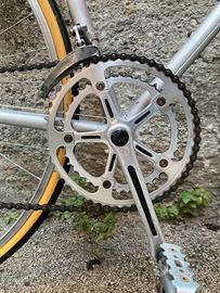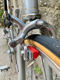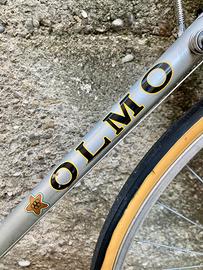 Bicicletta Olmo del 1978, taglia 54. Telaio in tubi di acciaio Columbus, con testa forcella e pendenti incisi. Il montaggio prevede un gruppo cambio Campagnolo Nuovo Gran Sport, e guarnitura Ofmega. I freni sono Universal modello 125. Le ruote sono assemblate con mozzi Ofmega a flangia alta e cerchi Ambrosio per copertoncino. La bici è stata attentamente restaurata, e tutti i componenti sono in ottime condizioni. Le ruote, in particolare, sono verificate e correttamente tensionate. La bici gira fluida e silenziosa, è adatta ad un uso gravoso anche su strade dissestate, ed è perfetta per partecipare ad eventi ciclostorici. Il telaio mantiene la prima verniciatura e i suoi adesivi d'epoca, c'è qualche imperfezione qua e là, ma si è preferito mantenere l'originalità.