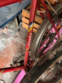 Vendo bicicletta da corsa vintage Atala “Officine Meccaniche”, presumibilmente anni ’70. Telaio in acciaio rosso con grafiche originali, ruote 28” (circa), freni e componenti d’epoca. Bici ferma da molti anni in garage: necessita di revisione completa (gomme e camere d’aria da cambiare, controllo freni, cavi e movimento centrale) prima di essere utilizzata. Ideale come base per restauro o per appassionati di bici d’epoca.