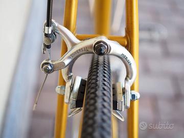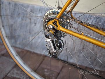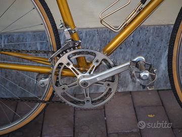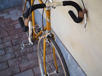 Bicicletta da corsa fine anni '70 o primi anni '80. Marca Fratelli Sala di Biassono (ditta ancora attiva). Telaio molto bello colore oro originale. Completamente restaurata e revisionata. Cavi e guaine freni nuovi, nastro manubrio nuovo, gomme paramani nuovi, ruote e mozzi revisionati, coperture e camere d'aria nuove, revisione movimento centrale e serie sterzo. Deragliatore posteriore Campagnolo 980, deragliatore anteriore Campagnolo, leve e pinze freni Universal 125, guarnitura Ofmega, pedali (molto belli) Roto, ruote con copertoncino. Disponibili anche le gabbiette comprese nel prezzo e visibili in foto. Misure 58 verticale, 56,5 orizzontale, adatta a persone alte più di 180 cm. Ottima per partecipare all'Eroica o ad altre ciclostoriche. Si trova a San Donato Milanese, ritiro e trasporto a carico dell'acquirente. Non spedisco.