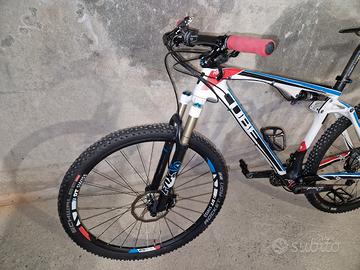 Modello: Cube AMS 100 Super HPC SL 29 Taglia 21 Vendo bici MTB Cube da XC full 100 mm tagliandata da pochissimo: sostituiti tutti i cavi e guaine, cuscinetti, dischi e pastiglie freno, olio freni, manopole, ingrassate tutte le parti mobili. Revisione completa ammortizzatore e forcella in negozio. Monta sella superleggera in titanio / carbonio e reggisella ritchey in carbonio (disponibili anche componenti originali). Taglia 21 pollici ovvero una L / XL adatta per persone da 180 a 190 cm circa. Vendo per passaggio a bici front. Monta pneumatici Schwalbe Rocket Ron 2.1 super leggeri ma disponibili anche pneumatici più strutturati ancora in buono stato. Di seguito le caratteristiche tecniche: - Color Teamline - Frame Super HPC Monocoque Advanced Twin Mold Technology, ARG, ERC FSP 4-Link, AXH - Fork Fox 32 Float 29 CTD FIT, remote handlebar lever, tapered, 15QR, 100mm - Rear Shock Fox Float CTD Remote, 165x38mm, Climb/Trail/Descend mode, remote handlebar lever, SV air canister - Headset FSA Orbit I-t integrated, top 1 1/8", bottom 1 1/2 - Stem Syntace F149, 31.8mm, 6° - Handlebar Syntace Vector 2014, 700mm - Rear Derailleur Sram XO 10-speed, Type2, medium cage - Front Derailleur Sram XO, High Direct Mount, 2x10-speed - Shifters Sram XO Trigger 2x10-speed - Brake system Formula R1 hydr. Discbrake (180/160mm), tool-free reach adjust - Crankset Race Face Next XC Carbon 24/38T, 175mm - Wheelset DT CSW MA 2.9 straightpull wheelset, 28/32 spokes, 15QR/X12, 622x19C rim, alloy nipples - Seat Selle Italia X1 - Seatpost CUBE Prolight 31.6*400mm - Seatclamp CUBE Varioclose 34.9mm - Shock hardware front: 22x8mm, rear: 40x8mm - Weight 10,8 kg Per qualsiasi chiarimento preferibile contatto telefonico o whatsapp. Bicicletta mountain bike enduro all terrain hardtail hard tail full-suspension cross country allmountain all marathon trail bikes