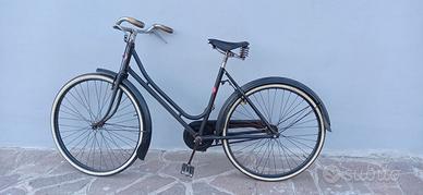 Bici da donna anni 30,freni a bacchetta e ruote misura balloncino. Senza marca, telaio a congiunzioni invisibili stile Maino e Amerio. Restaurata parecchi anni fa. Comoda e robusta, perfettamente funzionante, non fa neanche un cigolio. Manopole in corno e sella Brooks
