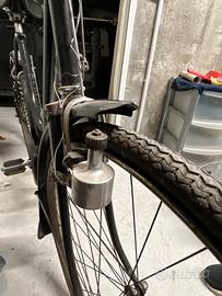 Bici originale dell’epoca con parafanghi in metallo, carter copricatena, campanello vintage e faro anteriore.
