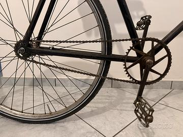 Il manubrio è un Ambrosio anni 30 e le ruote sono per freni a bacchetta, con mozzo posteriore dotato di freno contropedale.