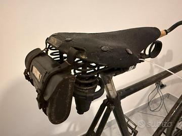 La bici ha telaio, guarnitura, pedali, sella con borsetta porta attrezzi e faretto a petrolio (da revisionare) originali.