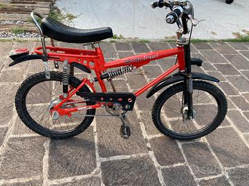 Bici anni 80 biammortizzata con sella lunga, freni a tamburo, gomme nuove, tutti i pezzi originali più aggiunta di cavalletto e fanale.