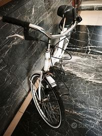 Il telaio è bianco lucido, senza canna (pensata per chi vuole salire e scendere con eleganza), ruote da 20" con gomme in ottimo stato, sella nera comoda, portapacchi con rete, parafanghi integri, luce posteriore funzionante e cavalletto perfetto. Facilissima da portare in auto o da riporre in casa.