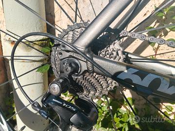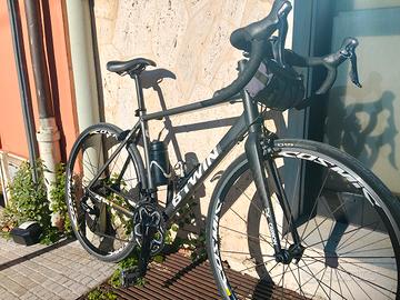 Vendo bici da corsa Triban 540 taglia M. Telaio in alluminio forcella in carbonio. La bici è predisposta per montare il portapacchi anteriore e posteriore ed è quindi adatta anche al cicloturismo. La bici può ospitare copertoni fino alla misura 35. Monta ruote Mavik Askium non di serie (molto più leggere e performanti di quelle di serie). Trasmissione Shimano 105. Poche settimane fa ho montato pacco pignoni 11-34 e catena nuova. È stata usata davvero poco in considerazione del fatto che principalmente vado in mtb. Vendo per passaggio a gravel. Non spedisco.