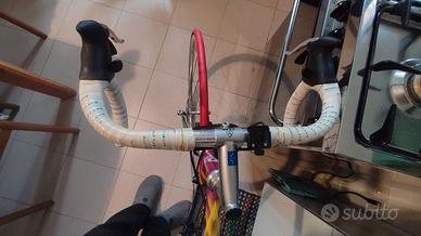 Battaglin vintage telaio in acciaio misura 56 per persone di 175-182 cm circa. Comandi campagnolo ergopower al manubrio. Guarnitura 53-39 cassetta campagnolo 8v 13-26. Gruppo trasmissione, serie sterzo mozzi, ruote comandi cambio e freni tutti campagnolo Mirage, deragliatore veloce. Usata davvero poco e poi ferma in appartamento, appena sostituiti copertoncini. Non spedisco, per favore astenersi perditempo. Prezzo richiesto 600 euro