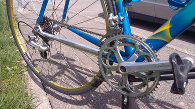 Realizzata con telaio in alluminio e forcella in carbonio, monta cambio SHIMANO DURACE con rapporti anteriori 39- 53 e posteriori 13- 15- 17- 19- 21- 23- 25- 28.