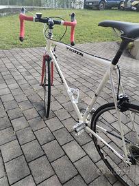 Questa è una bici da corsa vintage o in stile classico, con telaio in acciaio verniciato in bianco e rosso (marca Piotrex). Ha un manubrio drop bar avvolto con nastro rosso, freni a pinza, pedali flat, e una forcella anteriore dritta in tinta con il manubrio. Il design semplice e pulito, insieme alla geometria del telaio, suggerisce un'impostazione pensata per l’uso su strada, magari anche in stile urbano o fixed.