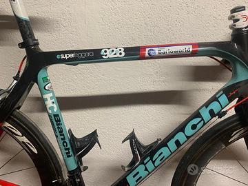 Bici da corsa Bianchi carbonio alto modulo modello 928 Superleggera in dotazione ( anni fa ) al Team di professionisti Barloworld taglia 57,5 montata come da descrizione: Ruote ZIPP carbonio alto profilo 404, freni, cambio, deragliatore e comandi Shimano Ultegra 2x10 v , guarnitura Dura Ace 53x39, reggisella carbonio FSA , attacco manubrio Deda e manubrio 3T, Sella Selle Italia flite, pedali Time, completa di seconda coppia di ruote per l'inverno Mavic Elite in alluminio. Bicicletta performante e molto leggera.