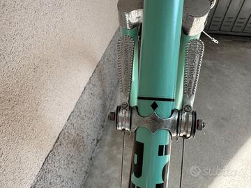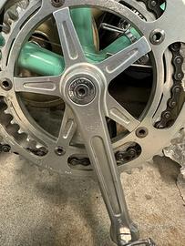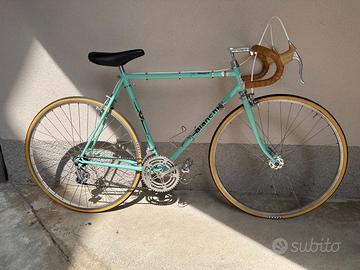 Bici da corsa Bianchi Campione del mondo 1973-74 Ottima per rievocazioni storiche o per Eroica Restaurata. Il telaio è stato riverniciato con il colore originale con cui è uscita e sono state rimesse le decalcomanie. La parte meccanica è stata revisionata e sono stati sostituiti i pezzi non più funzionanti. Caratteristiche: Piantone manubrio: Record 3 ttt Manubrio: Cinelli Mod Giro d'Italia Leveraggi e deragliatori: Campagnolo Freni e leve freni: Universal Pacco pignoni: Regina Extra Guarnitura: Campagnolo Pedali: senza marchio Ritiro in zona