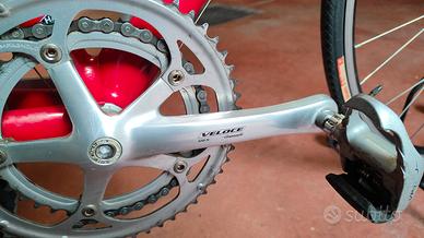Vendo bici da corsa Bianchi Pro Race Team, misura del tubo piantone 54 centro/fine, tubo orizzontale 55 centro/centro, montata in Campagnolo Veloce con comandi e cambio posteriore Campagnolo Mirage, monta pedali automatici VP. Bicicletta in superbe condizioni generali, perfetta nell'estetica, perfettamente regolata e lubrificata in ogni sua parte, pronta per essere impiegata fin da subito, ideale per chi vuole avvicinarsi al mondo delle bici da corsa con una spesa modesta e la soddisfazione di montare lo storico marchio Bianchi. Visionabile a Marcon (VE). Euro 220