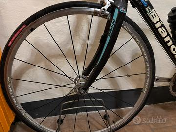 Bici da corsa ufficiale bianchi che ha gareggiato con il team pennelli conghiale al giro d italia . Cerchi con razze a taglio in carbonio forcella e in carbonio ecc