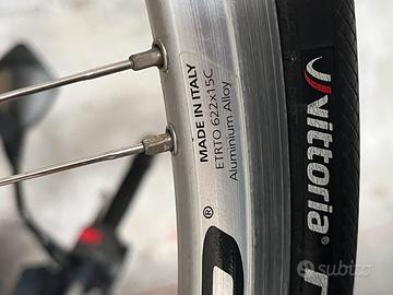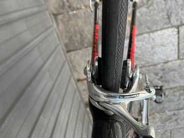 Telaio in carbonio, cambio Campagnolo, freni a pattino. La bici ha più di 10 anni ma nuova era di fascia alta; è in ottimo stato. Un buon compromesso qualità/prezzo per iniziare o da usare sui rulli.