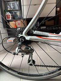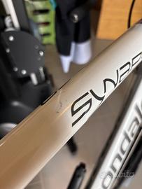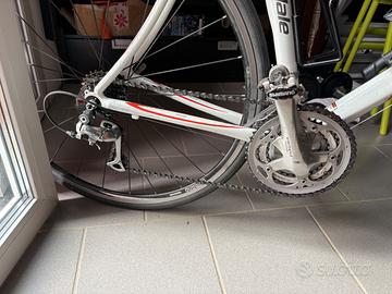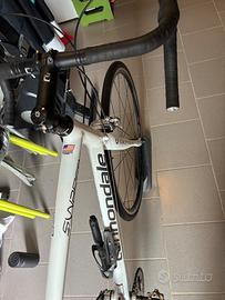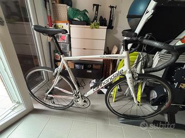 bici da corsa Cannondale taglia 58, bianca, cambio meccanico e freni con spazzole. La bici è tenuta bene, mostra segni e piccoli graffi dovuti all’utilizzo esclusivamente estivo. E’ presente un bollo sulla parte superiore del telaio (vedi foto) ma, come mi è stato detto dal meccanico del negozio da cui ho comprato la bici usata, la resistenza non è stata alterata. Ogni anno la bici è stata controllata in negozio prima dell’utilizzo estivo.