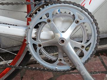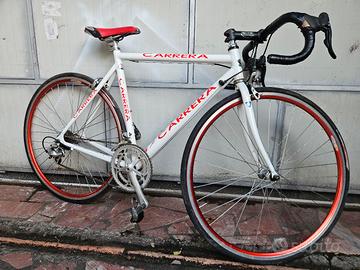 Vendo bici da corsa Carrera in alluminio monta trasmissione 2x9 campagnolo e freni caliper; ruote profilo medio con cerchi rossi e copertoni strada.