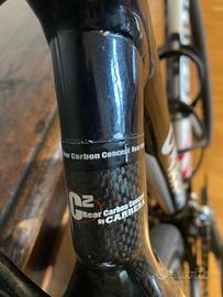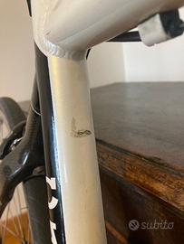 Carrera da corsa, fine anni 2000, alluminio con forcella in carbonio. Peso circa 6kg. Cambio Campagnolo Record Titanium, 50-34. La vernice del telaio è un po' rovinata in alcuni punti (vedi foto). Usata da una persona alta circa 1.70, vedi seconda foto per misure precise. Leggera (circa 6 kg) e molto amata ❤️