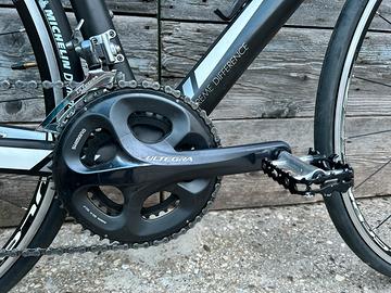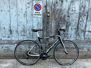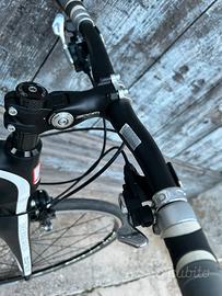 Bicicletta da corsa in carbonio con manubrio flat e attacco regolabile, misura 53, montaggio Shimano Ultegra a 10 velocità, ruote Fulcrum Racing 7, coperture Michelin nuove 25mm, portaborraccia in carbonio, usata pochissimo, come nuova.