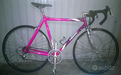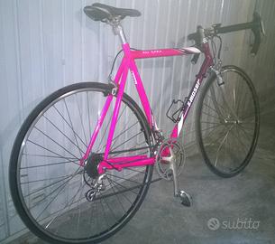 Bici da corsa Francesco Moser modello Alu Gara del 1995, interamente made in Italy, molto rara per colorazioni e grafiche commemorative Anniversario Record dell'ora Messico '84. Unico proprietario, tenuta in modo maniacale, in ottime condizioni e perfettamente funzionante in ogni sua parte. Telaio Oria a tubi profilati tondi a diametri variabili, a triplo spessore in lega di alluminio-zinco serie 7020, ad alta resistenza e rigidità, saldature invisibili. Taglia telaio M, misura 54-56 circa, per altezza ciclista 175 cm. circa. Guarnitura completa Campagnolo Veloce Ergo Power 8v, colore grigio satinato opaco, con comandi sul manubrio. Manubrio in alluminio marca I.T.M mod. Mondial con piega-curva classica italiana e larghezza standard 42cm. Pipa manubrio marca I.T.M. mod. Eclypse. Nastro manubrio nuovo Deda gel. Corone gara 53/39 e cassetta pignoni gara 11/25. Pedali con sganci rapidi Campagnolo Veloce. Guaine Campagnolo di colore nero, integrate internamente nel telaio. Cerchi e ruote Campagnolo mod. Gamma Alloy 6061-T6 in magnesio 28" 32 fori, colore nero. Raggi in acciaio inox. Mozzi in acciaio inox a coni-sferette Campagnolo mod. Pista. Pneumatici tubeless 700cc 23 nuovi, Michelin Sport Compétition, di colore nero. Steli anteriori a sezione vuota in acciaio inox cromato Moser Designer. Tubo reggisella in alluminio con innovativo sistema di serraggio a scomparsa. Sella marca San Marco Italia mod. Era gel, con fessura centrale. Peso totale bici 9kg. circa. Solo ritiro a mano. Richiesti 395 euro.
