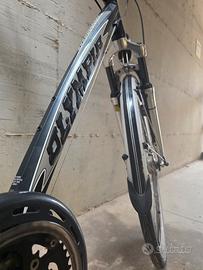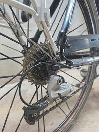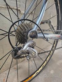 Vendo splendida bicicletta da corsa di marca FRW, in ottime condizioni meccaniche ed estetiche, come dimostrano le foto. Il telaio è in alluminio idroformato (con dicitura "Hydroforming Technology" visibile sulla forcella), leggero e reattivo, con una colorazione argento metallizzato molto elegante, arricchita da dettagli grafici rossi e neri. La bici è ideale sia per chi vuole iniziare con un mezzo di qualità, sia per amatori che cercano una bici da allenamento affidabile. Specifiche Tecniche: Telaio: FRW in alluminio idroformato "Made in Italy", molto curato nelle finiture. Forcella: Carbon/Alu con tecnologia Hydroforming. Gruppo Cambio Completamente Shimano 105: Leve Cambio/Freno (STI): Shimano 105 10 velocità (con dicitura "Flight Deck"). Deragliatore Posteriore: Shimano 105. Deragliatore Anteriore: Shimano 105. Freni: Caliper Shimano 105. Guarnitura: Shimano (probabilmente 105, ma non leggibile completamente), tripla corona (3x) per affrontare qualsiasi salita. Pacco Pignoni: 10 velocità. Ruote: Mavic, note per robustezza e scorrevolezza. Componenti: Reggisella, attacco manubrio e curva manubrio ITM. Sella ergonomica con borsa sottosella inclusa. Pedali flat in metallo (visibili in foto). Accessori Inclusi: Portaborraccia e borraccia fumé, borsa sottosella porta attrezzi. Stato e Manutenzione: La bicicletta è sempre stata tenuta al chiuso, come si nota dalla totale assenza di ruggine. La trasmissione è pulita e lubrificata, i freni sono efficienti e i pneumatici sono in buono stato. La nastratura del manubrio è in ottime condizioni. È pronta per pedalare fin da subito