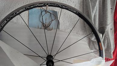 Regalo coppia cerchi Campagnolo Zonda in alluminio, pompa da piede con manometro, e il piedistallo nella foto