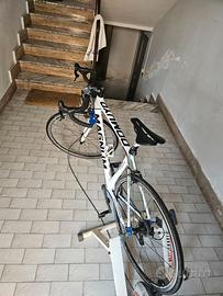 Bici tutta in carbonio perfettamente funzionante deve solo camminare sempre usata solo per rulli ottima per chi vuole iniziare e non spendere una fortuna o come bici invernale per rullo. La bici monta un campagnolo 11v e guarnitura Dure ace 53/39. Ruote in alluminio campagnolo.