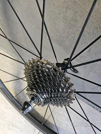 La bici in configurazione come da foto, con cerchi in carbonio Zefiro T-50 (posteriore leggermente curvato ma usabilissimo, nessun problema), pastiglie freno per cerchi in carbonio e tubolari tufo praticamente nuovi è in vendita a 700 euro (includo ovviamente anche le ruote in alluminio in perfette condizioni, come in foto).