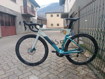 Montata con gruppo Shimano 105 (deragliatore anteriore e posteriore), freni a disco Shimano 105, ruote in carbonio ad alto profilo decaf cattiva e manubrio decaf ariete.