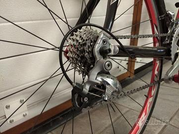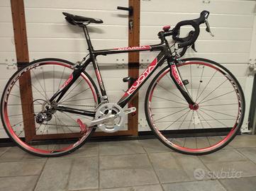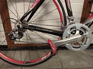 Per inutilizzo, vendo bici da corsa Kuota con telaio e forcella in carbonio. Nonostante non sia un modello recente, la bici si presenta in ottimo stato perchè ferma e inutilizzata da parecchi anni. Ha qualche graffio a seguito di una caduta e di qualche caduta di catena, ma assicuro che strutturalmente e meccanicamente è assolutamente in ottime condizioni. Montata tutta shimano 105 con rapporti 2x10 ( guarnitura 50-34 ) e ruote Fulcrum. Catena, copertoni e deragliatore posteriore appena sostituiti, pedali Look a sgancio rapido di cui lascio anche le scarpette quasi nuove e comprate assieme alla bici. Taglia S per persone con altezza 160-172 cm. Pochi km percorsi ( basta guardare le scarpette per capire quanto è stata usata). Consegna a mano e ritiro sul posto. Prezzo poco trattabile.