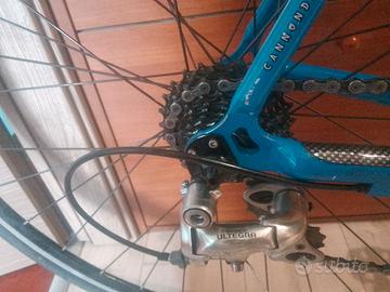 Bici da corsa cannondale r800 taglia 54. Freni, manopole e deragliatori shimano ultegra. Telaio in alluminio caad4. Forcella e reggisella in carbonio. Piega manubrio, attacco manubrio (110mm) e reggisella ritchey. Ruota anteriore con raggi piatti e sgancio rapido. Guarnitura 2 velocità 46/30 pignone 9 velocità 12/25
