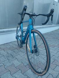 Vendo causa inutilizzo Bici da strada Modello Basso Venta blu (come da fotografie) taglia 51 (orizzontale 51) per persone di altezza tra 1,65 cm e 1,75 cm circa, con cambio Shimano 11 velocità meccanico, manubrio aero vision Trimax, sella Selle Italia, ruote altezza 26 Microtech, dischi da 160 mm , rivestita completamente di pellicola protettiva.