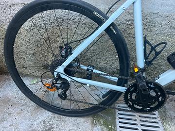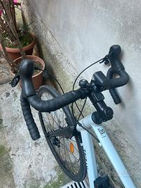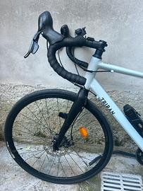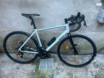 Bici da corsa Triban Decathlon, colore grigio chiaro. Taglia M (173-182). Rapporti 2x8, telaio in alluminio, forcella in carbonio e freni a disco. Molto leggera. Praticamente mai usata. Prezzo sul sito decathlon 549 euro. La vendo con il portaborraccia e cavalletto (non sono inclusi la catena e il contachilometri). No scambi.