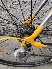 Olmo equipe, telaio alluminio tubi Oria, forcella 1" in carbonio gruppo campagnolo veloce 9v, guarnitura compact perno passante 50-34, reggisella carbonio deda superleggero, serie sterzo campagnolo, sella prologo, ruote campagnolo neutron, gruppo campagnolo, copertoni Continental pochi km. Bici pronta all' uso perfettamente funzionante. disponibili anche forcella, pipa e manubrio originali. Telaio misura 56-57. prezzo trattabile. Valuto anche scambi.