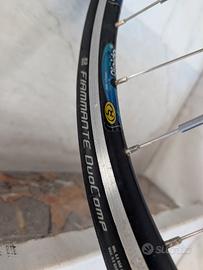 I cerchi sono dei Mavic CXP (uno dei produttori più rinomati al mondo). Sono cerchi in alluminio a "profilo medio", noti per essere estremamente robusti e affidabili. A differenza dei cerchi classici piatti, questi hanno una sezione leggermente a triangolo (profilo semi-aerodinamico), che serve a dare maggiore rigidità alla ruota e un piccolo vantaggio contro il vento. Montano raggi in acciaio inossidabile con una raggiatura tradizionale (incrociata), il che rende la ruota facile da centrare e riparare da qualsiasi meccanico, oltre a offrire un buon comfort sulle buche.