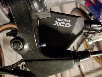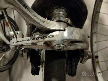 Bici da corsa Olympia Vantage colore blu e rosso in ottimo stato, taglia tubo orizzontale 52 cm, tubo verticale 48 cm, in alluminio 7005 con forcelle in carbonio, cambio Shimano Deore 2 x 10 velocità con leve microSHIFT XCD, flat bar con manopole GP1 - Ergon, freni Campagnolo.
