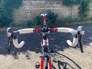 Monta gruppo Shimano Ultegra 10 velocità (50/34 – 12/30) con pedivelle da 172,5 mm e freni rim Ultegra.