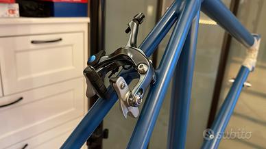 La bici è stata COMPLETAMENTE restaurata. Sabbiata, verniciata di questo splendido blu, monta tutto Shimano Tiagra 10v 12-28t guarnitura 52-36, cerchi Mavic in carbonio con pista frenante in alluminio, gomme Pirelli cinturato 25mm come NUOVE. Reggisella, attacco manubrio e manubrio Deda Zero. Pedali doppio attacco Shimano. Nastro Supacaz, sella Fizik R5. Taglia M (170/178cm)