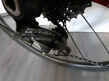 Vendo bici da corsa causa inutilizzo usata pochissimo marca Merida con telaio monoscocca totalmente in carbonio taglia L 54 completa di cerchi Mavic in carbonio tubless ready profilo 40 con copertoncini Pzero, cambio Shimano Ultegra con rapporti 50/34 11/32 manubrio e pedivelle FSA, sella Prologo Pro