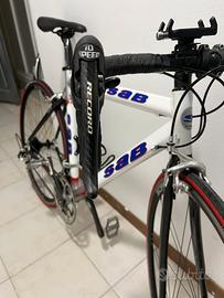 Vendo per passaggio ad altra tipologia, bici da corsa SAB taglia M con cambio Record 10v(in vendita usato su altra piattaforma a 350€), telaio alluminio e carbonio, tubo sella in carbonio(70€) cerchi Campagnolo Scirocco con pneumatici Michelin montati da circa 100km. Prezzo leggermente trattabile.