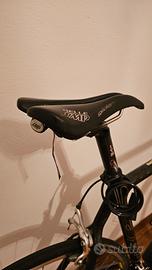 Vendo bici da corsa in carbonio della SAB, azienda di San Marino, telaio completamente in carbonio, reggisella e manubrio anch'essi in fibra di carbonio della ITM, sella SMP in pelle, ideata per evitare problemi alla prostata, cambio Campagnolo Veloce a 9 rapporti, freno anteriore e posteriore sempre Campagnolo Veloce, pneumatici continental in buone condizioni, bici con non più di 1000 km, taglia L adatta per persone alte da 180cm a 188cm, qualche leggerissimo graffio sul telaio e sul manubrio ma nulla di evidente, per altre informazioni o foto contattatemi, prezzo trattabile nel limite del possibile, ritiro in loco, no spedizione