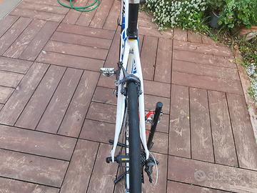 Bici da corsa Specialized modello TARMAC - SL2 – anno 2012 – interamente montata Ultegra 10V, reggisella in carbonio, cerchi Mavic Ksyrium, piega e manubrio Easton in alluminio. Sella Italia SLR un po' usurata/scolorita sui fianchi. Sempre tenuta in casa. Buone condizioni generali, pronta da utilizzare senza alcun intervento. catena sostituita recentemente, sella un pò scolorita sui laterali. Distanziali sullo sterzo presente. Bici eccezionale, reattiva e leggera, vendo solo perché passo ad una endurance con ruote da 35 mm per problemi di schiena. Compreso nel prezzo della bici sono presenti: pompa Airburn stick in alluminio, nastro bianco EASTON ancora confezionato (sotto il nastro attuale ci sono i pad in gel Specialized riutilizzabili), portaborracce e borracce Zefal da (750 e 500 cc), portacomputer centrale per Garmin, torcia anteriore con batteria al litio ricaricabile (seminuova) che si monta sotto il portacomputer, borsetta portattrezzi posteriore sottosella in tinta ciclolinea. Documentazione di acquisto originale presente con manuale e scontrino. Pedali non compresi.