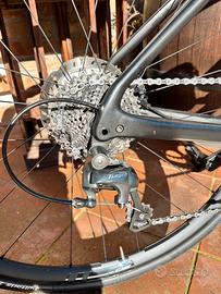 Specialized roubaix taglia 49 x altezza da 1,50 a 1,65 ruote fulcrum 3 disk 10 velocita’, gruppo 11/32 posteriore, 50/34 anteriore copertoni nuovi da 32 mm e di scorta da 30 mm della specialized turbo pro’, monta di serie la cartuccia anti vibrazioni future schok 1.5 , caratteristica speciale del telaio roubaix. Attualmente monta manubrio e comandi flat bar con possibilita’ di tutti i comandi e curva manubrio originali , la bici e’ comodissima, se la vendo e per il tempo che non ho pultroppo !! Strumento bryton s800 con tutti e 3 i sensori