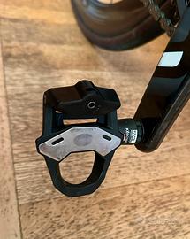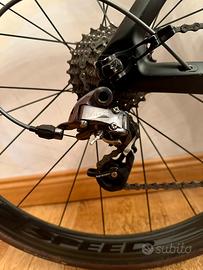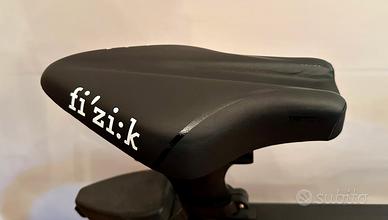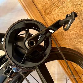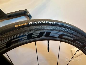 Bici corsa Speeder Cycling per triathlon crono, come nuova. Swiss made, tg. M, adatta per altezze da 176 a 185 cm. Nero opaco Leggerissima, peso totale bici accessori: 7,9 kg. Perfetta, come nuova, utilizzata sempre su rulli. Telaio aero Speeder Cycling in carbonio UCI Approved con geometria ottimizzata per triathlon no draft (70.3 e Ironman). Tubo orizzontale 54 cm, tubo verticale 54 cm. Guarnitura SRAM “Force 22” in carbonio, corone da 53/39T, 11 speed, pedivelle da 172,5 mm. Pedali in carbonio Look Kéo 2 Max Carbon. Deragliatore anteriore SRAM “Rival” 22 2x11. Deragliatore posteriore SRAM “Force 22” 11 speed, Exact actuation. Pacco pignoni SRAM Cassetta Force 22 PG-1170 11s 11-28t. Freni Fouriers BR-S005 Direct Mount Aero V-Brake. Manubrio integrato in carbonio Speeder Cycling con leve freno SRAM 900 TT e manettini SRAM TT 500 11s alleggeriti. Appendici aero multispessore Deda, supporto specifico per ciclocomputer Garmin e nastro manubrio Supacaz Super Sticky Kush nuovo. Ruote in carbonio Fulcrum Racing Speed 50 RIM brake alto profilo per tubolare. Tubolari Continental Sprinter da 22mm nuovi appena montati. Nell’acquisto della bici viene incluso anche un ulteriore set di tubolari Continental Sprinter da 22mm nuovi, ancora in scatola. Mozzi Fulcrum 2:1 Two-to-One™ Spoke Ratio. Reggisella in carbonio Speeder Cycling Anti-vibration system con binario per scorrimento e inclinazione sella in massima estensione. Sella Fi’zi:k Tritone Carbon Braided Black nuova, specifica per triathlon con predisposizione attacco borracce. N. 2 portaborraccia e borracce Elite Crono CX Aero + sistema di idratazione anteriore Elite Aeton Triathlon Kit 750 ml. Aero. Tutti pezzi nuovi, mai utilizzati. Porta gel aero anteriore specifico per triathlon con fissaggio a telaio con velcro. Porta attrezzi aero posteriore specifico per triathlon con fissaggio su reggisella. Bici pronta all’uso, appena tagliandata. Visibile a Roma in zona Prati. Ulteriori foto su richiesta.