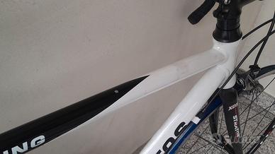 Telaio in alluminio e forcella in carbonio, monta gruppo Shimano Ultegra 6700 con tripla a 52 denti (escluso comando deragliatore anteriore, comando sx., cambiato con comando Shiamano Sora per tripla). Telaio in buone condizione, qualche graffio e residuo di vernice stradale sul lato inferiore del tubo obliquo, qualche graffio anche sul carro posteriore, sul tubo orizzontale e sul manubrio. Bici completamente funzionante, ma consiglio di effettuare revisione globale e cambio parziale di viteria di fissaggio.