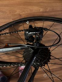 Vendo bici da corsa bianchi intenso dama bianca 105 del 2019. Vendo per passaggio modello successivo, tenuta benissimo, non ha nessun problema, è sempre stata tagliandata presso officina bianchi atlier boldrini, dove è stata acquistata (giusto l'anno scorso sono stati sostituiti entrambi i copertoni, i cuscinetti delle ruote e i freni). Telaio in carbonio, cambio shimano 105, freni a pattino, ruote fulcrum, copertone vittoria zaffiro pro graphene 2.0. Normali segni di usura come piccoli graffi su pedaline look (le uniche con cui viene venduta) e su manubrio (vedi foto) che però non intaccano la funzionalità della bici. il nastro del manubrio è appena stato sostituito. Disponibile per prova in zona aosta e dintorni (tra courmayeur e chatillon), no spedizione, solo consegna a mano.